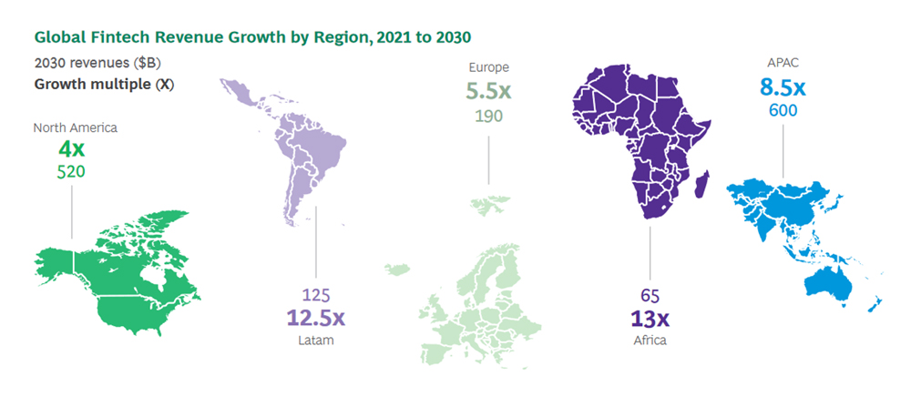 The brief but impactful period introduced the concept of Open Banking in its third era of FinTech (2010-2014). It allowed third-party entities secure access to financial data, sparking innovation and the creation of new digital banking products. It was a time of increased transparency and collaboration in the financial sector. The current era, FinTech 3.5 from 2014, is characterized by groundbreaking developments. Blockchain technology has taken center stage, offering new possibilities for secure and decentralized financial transactions. Open banking continues to evolve, enabling integrated payment providers to redefine how money is collected and managed. This era is synonymous with rapid innovation, pushing the boundaries of what’s achievable in the world of financial technology. Asia-Pacific Will Be the Largest Fintech Market by 2030, and Latin America and Africa Will Be the Fastest-Growing Regions. The following figure depicts the clear picture of the industry:
